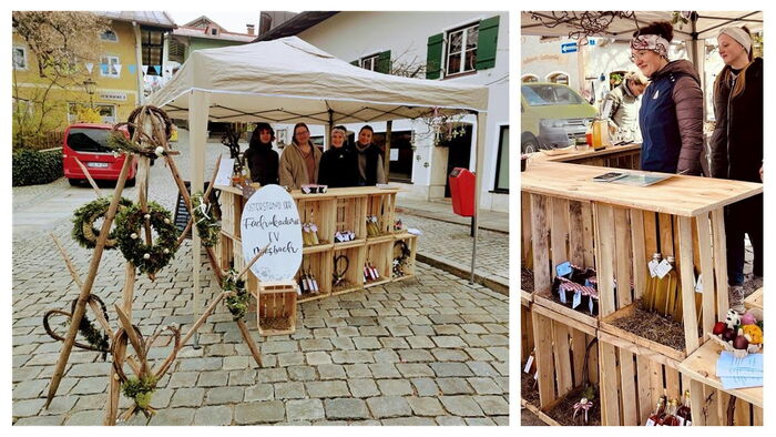 Am Donnerstag (10.04.2025) präsentierte die FAK EV 1 ihren Osterstand auf dem Miesbacher Wochenmarkt. Dieses Projekt bot den Studierenden die Möglichkeit ihre handwerklichen Fähigkeiten unter Beweis zu stellen und die Besucher des Wochenmarkts mit selbst hergestellter Produkte zu begeistern. Die Auswahl an liebevoll gefertigten Artikeln war ansprechend und vielfältig. Es gab z. B. ein köstliches Bärlauch Pesto, erfrischenden Ingwersirup und aromatischen Knoblauch-Essig. Für die Osterzeit wurden zudem gefärbte Eier und dekorative gefilzte Eierwärmer angeboten, die jedes Frühstück verschönern. Auch die kunstvoll gestalteten Kränze und Weidenherzen wie auch Palmkreuze für das Auto fanden großen Anklang.