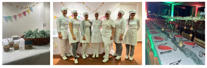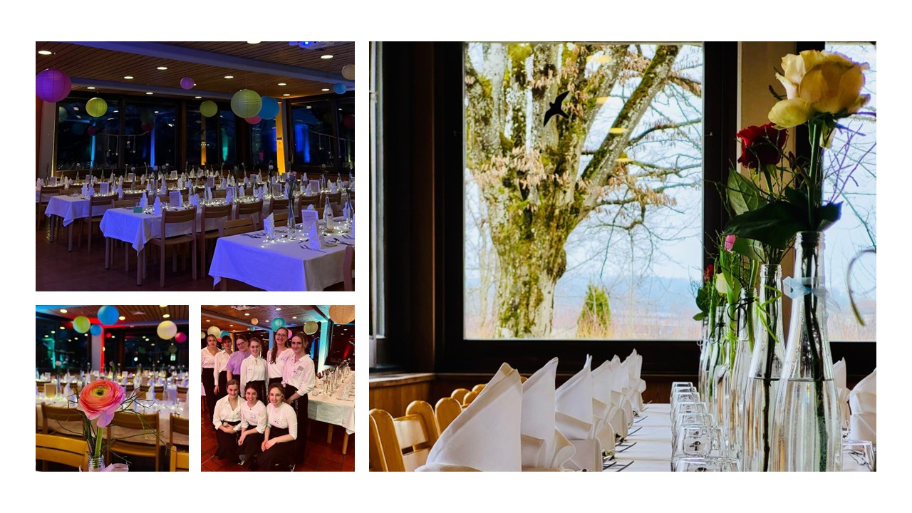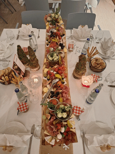 Die Studierenden der zweiten Klasse setzten ihr theoretisches Wissen praktisch um und übernahmen Planung, Organisation, Dekoration und Catering für rund 68 Gäste. Als Vorspeise wurde ein liebevoll arrangiertes mediterranes Brotzeitbrett mit feinen Antipasti, ausgesuchten Käsesorten und aromatischen Aufstrichen serviert. Im Hauptgang folgte zarter Rinderbraten an kräftiger Rotweinsauce mit winterlichem Blaukraut und buttrigen Walnussspätzle oder alternativ zarte Kräutergnocchi auf buntem Ratatouille. Das Dessertbuffet bot luftige Schokomousse mit fruchtigem Orangenspiegel, feine Feigen-Tartelettes und einen winterlichen Obstsalat.