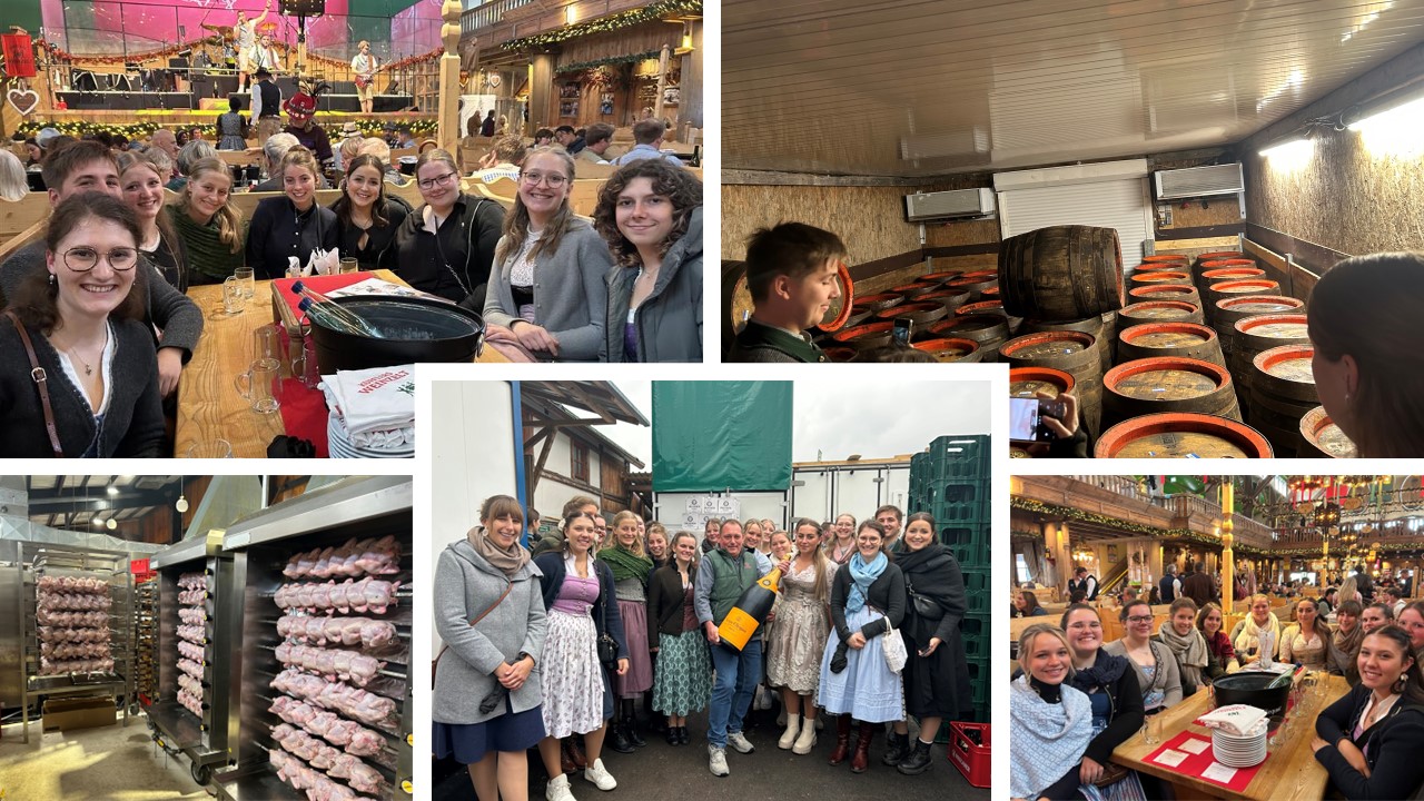 Bevor der offizielle Festbetrieb begann, durften wir bereits das Gelände betreten. Unser erster Programmpunkt war die Polizeiwache. Dort erhielten wir spannende Einblicke in die Überwachungs- und Sicherheitsmaßnahmen. Weiter ging es ins Augustiner Zelt, wo wir eine interessante Führung durch die Küche bekamen. Nach einem deftigen Weißwurstfrühstück setzten wir unseren Besuch in Kuffler’s Weinzelt fort. Dort erhielten wir einen Einblick in die Lagerräume, konnten viele Fragen stellen und bekamen zum Abschluss einen hervorragenden Kaiserschmarrn serviert.